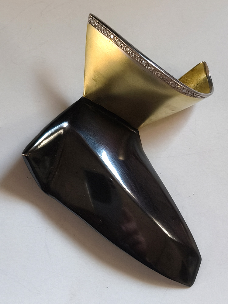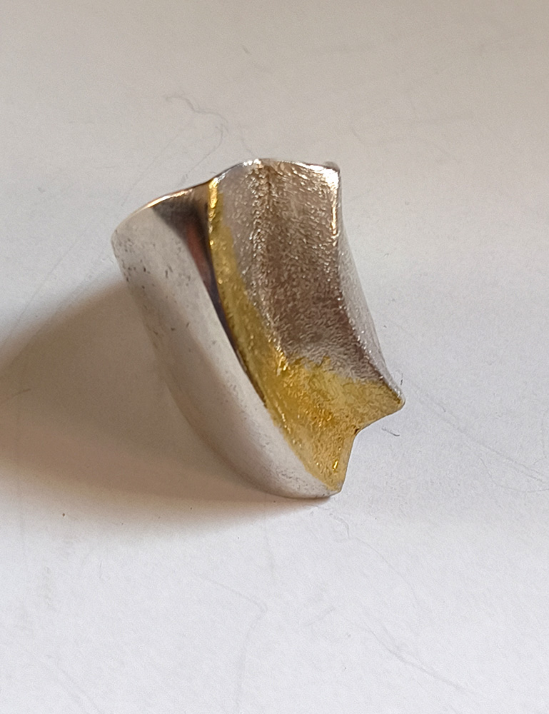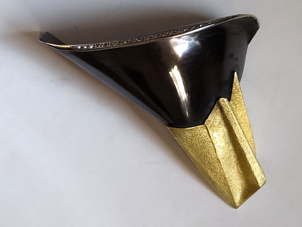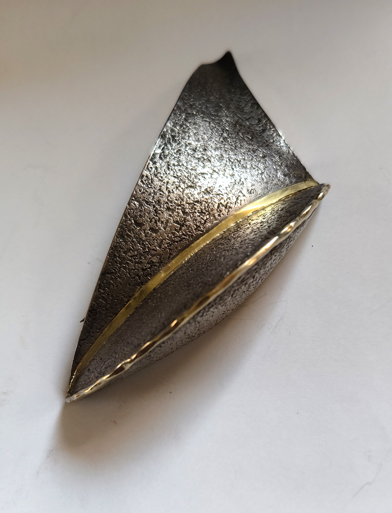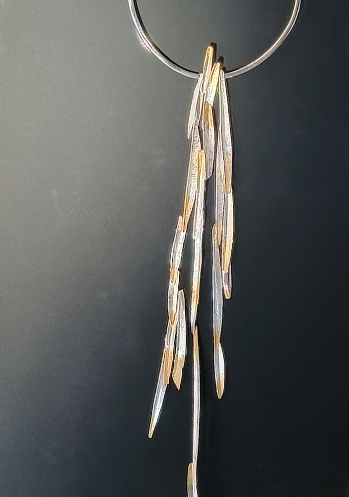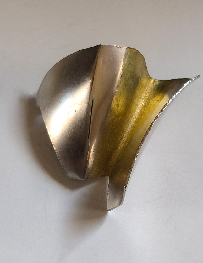 水流や光、書の筆勢、運筆・・・・動くもの一瞬の姿を図形化あてがねや、金槌を使った「反りのかたち」の連作銀地金は打ち出され、膨らみ、変容し「鼓動」します。
