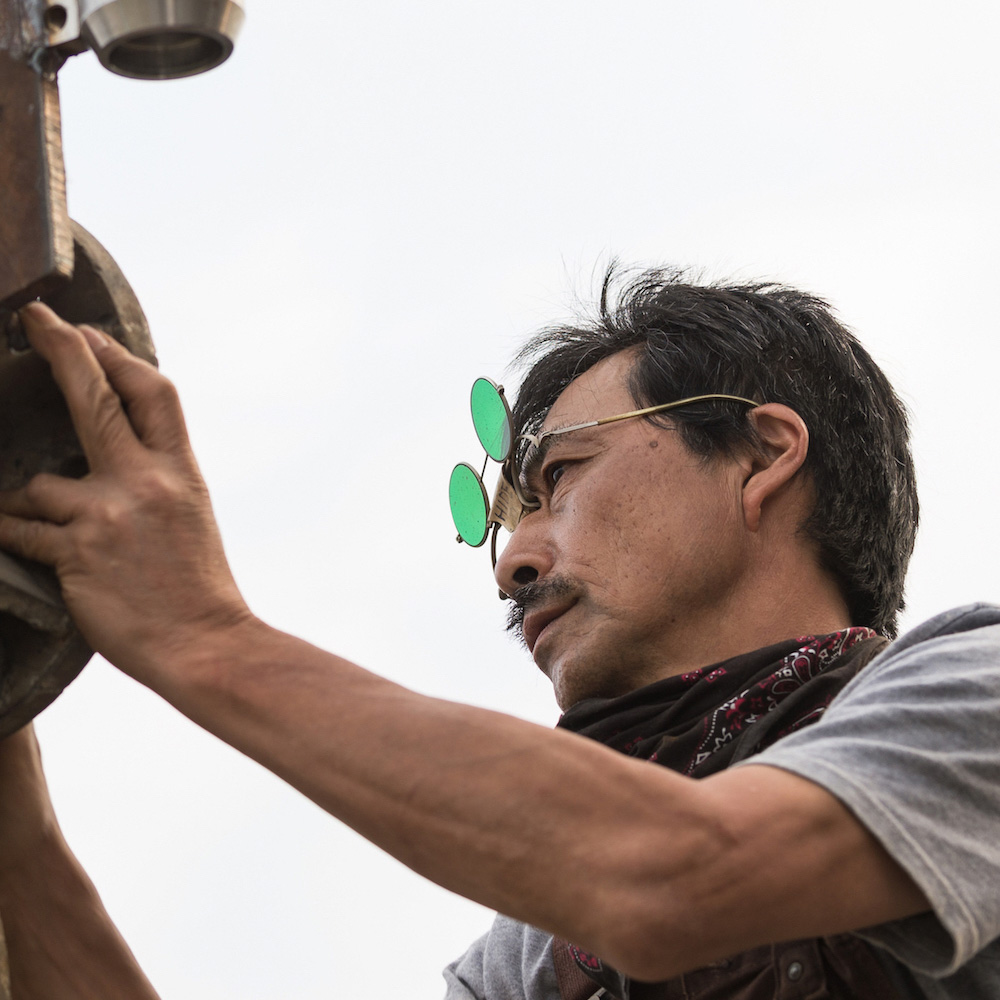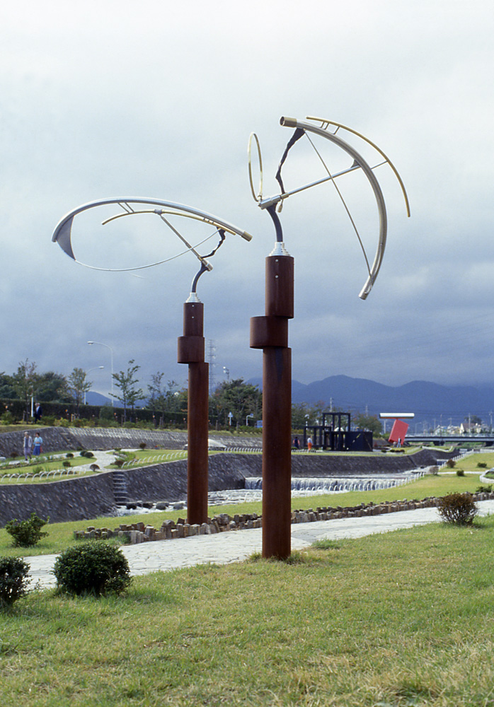 中学生の時、学校のすぐ前に箱根彫刻の森美術館が完成し遊びに行く。どうもこれが刷り込みとなったようで、デザインの世界を志して学ぶが、ちょっとずれて野外彫刻の道へ。運よく大学院在学中に第2回ヘンリー・ムア大賞展に入選、彫刻の森美術館に展示。以後「ちょっと待って」という思いを込め、風で動く作品を制作。